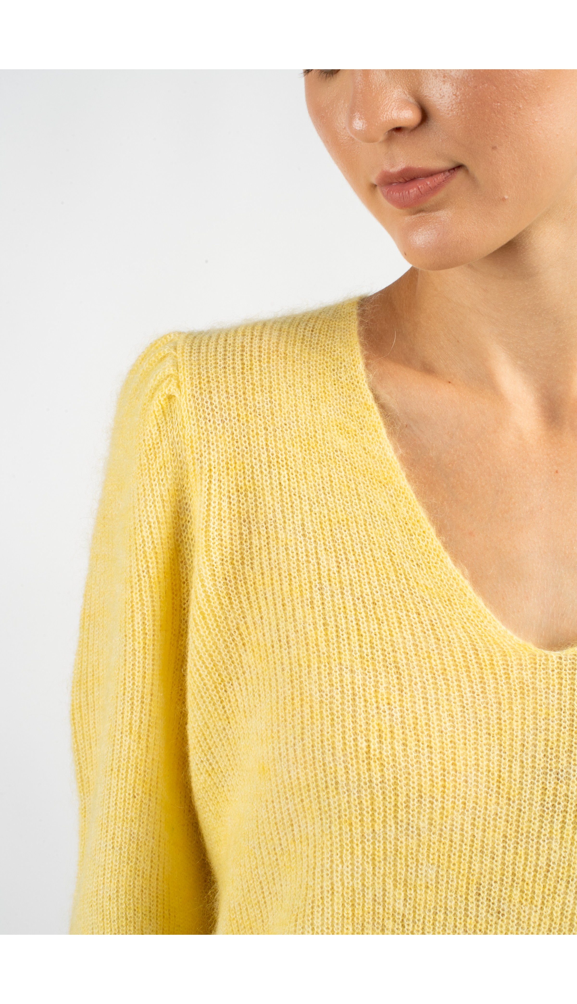 Soft V-neck sweater knitted from a blend of mohair and wool, featuring gently gathered shoulders and refined ribbed finishes with a subtle cable detail.